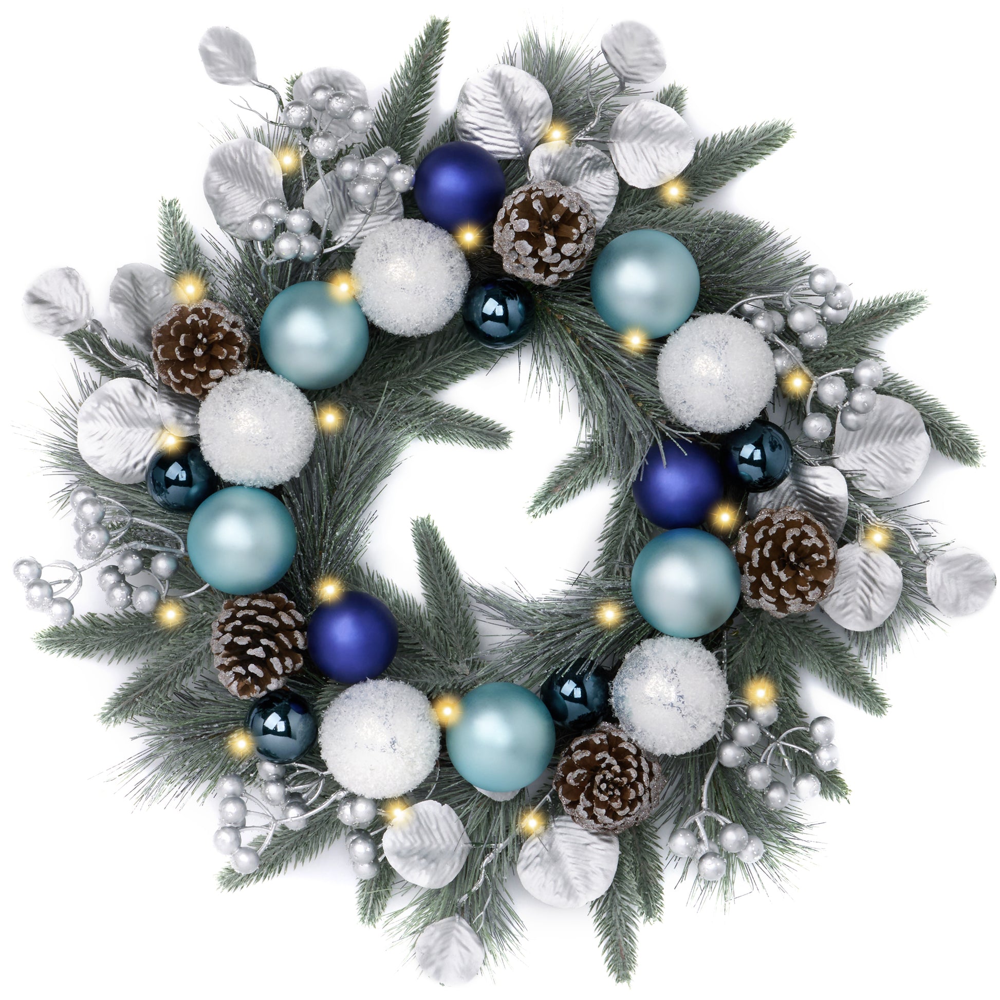 Valery Madelyn Pre-Lit Christmas Wreath for Front Door with Lights, 20 Inch Large Chritsmas Wreath with Pine Cone Berries Blue Xmas Balls for Fireplace Window Outdoor Table Centerpiece Decoration