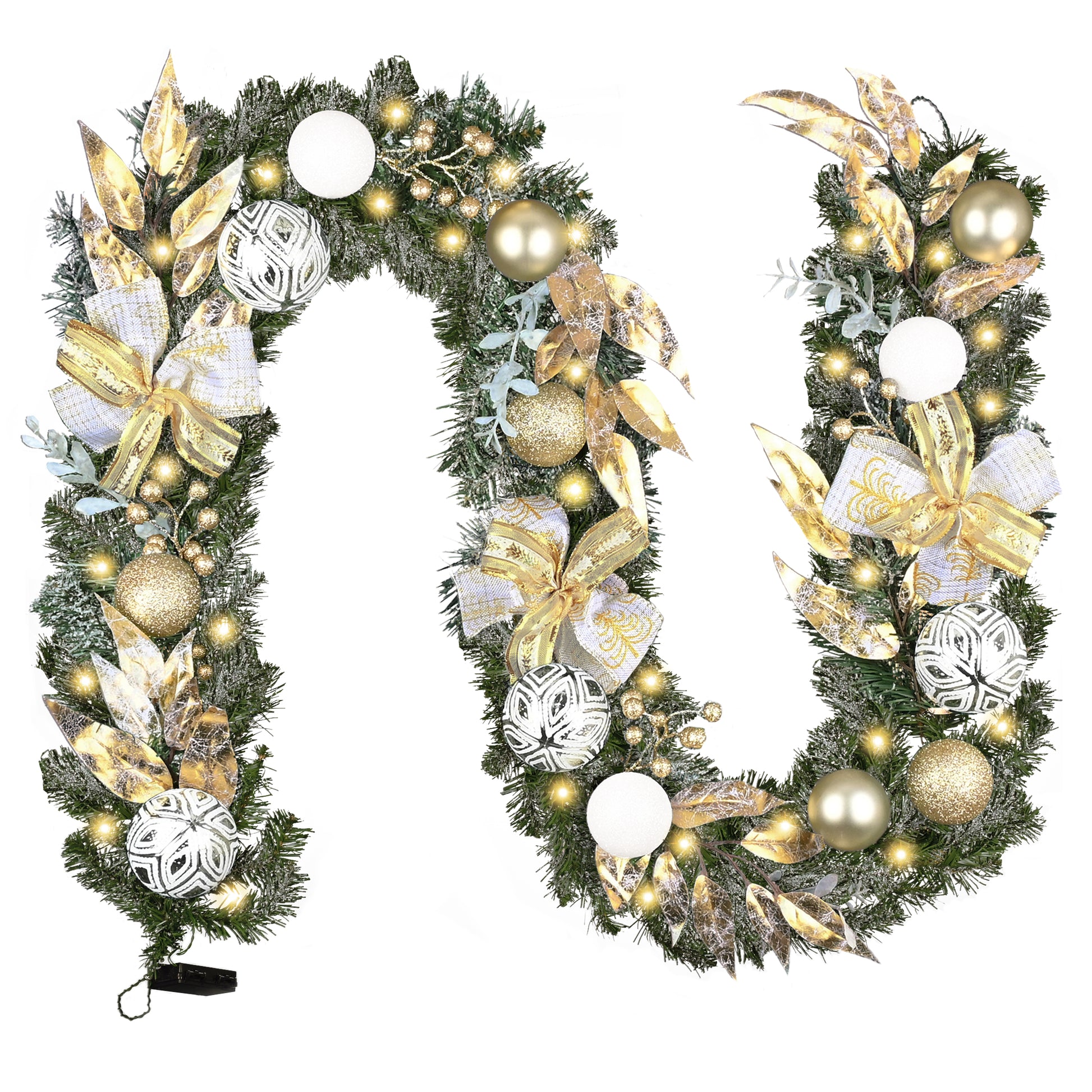 Valery Madelyn 9 Feet Pre-Lit Christmas Garland with Light for Mantle, Lighted Outdoor Xmas Garland with White Gold Ball Ribbon for Home Stairs Fireplace Table Centerpiece Indoor Holiday Party Decor